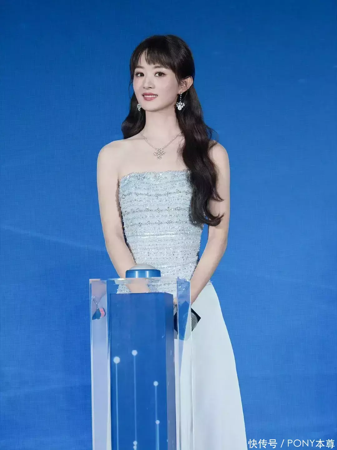 在穿搭上,蓝色亮片点缀的抹胸长裙,飘逸又灵动!上半身搭配银色珠宝项链,清新又大气!下半身的蓝色薄纱裙摆,则飘逸轻盈!在演艺圈多年,凭借自己的努力,出演了多种题材的作品,实力在线,气质也愈发沉稳!